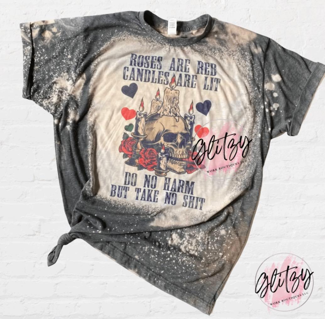 | ROSES ARE RED CANDLES ARE LIT DO NO HARM BUTTAKE NO SHIT Bleached Tee | Gildan Soft Style