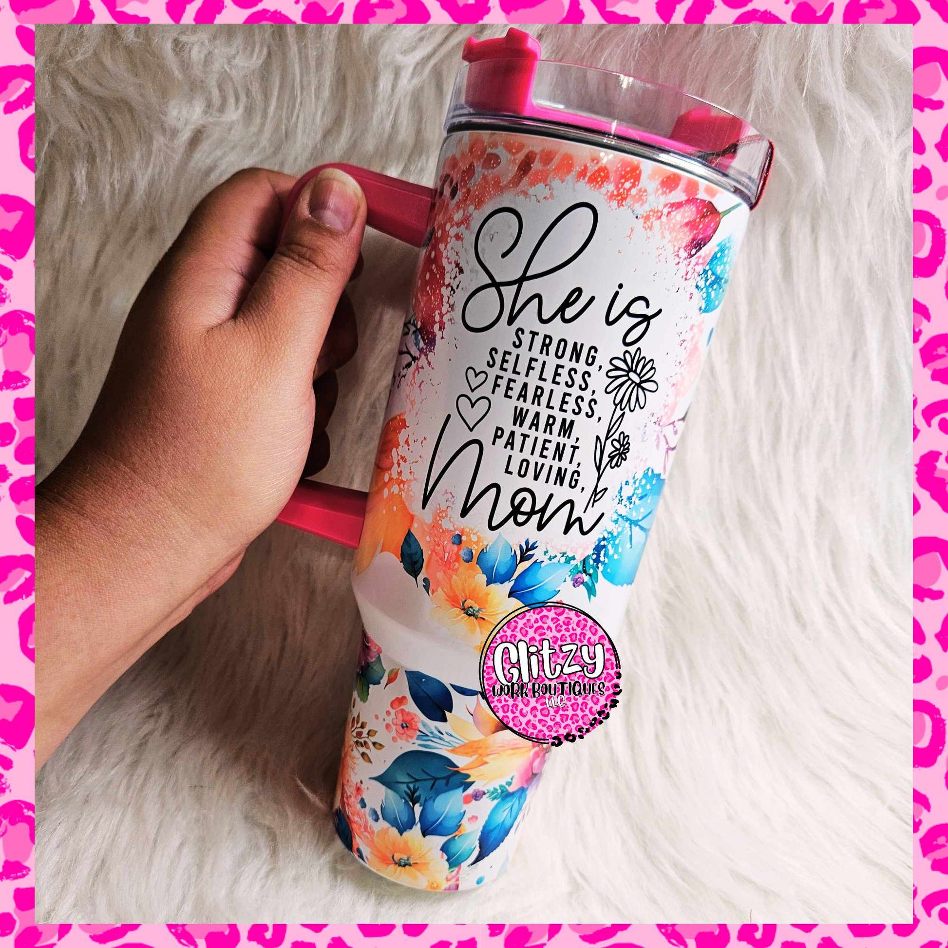 SHE IS MOM 40OZ TUMBLER is perfect for bringing your beverages on the go. Its vibrant colors and stylish design are ideal for both indoor and outdoor settings. The 40oz capacity ensures you never have to worry about your drink running out!